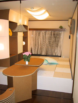 新婚カップルが住みたくなるようなお部屋まるごとダンボール家具を制作し、インテリアをコーディネートするもの。床下収納、照明、カーテン、クッションまで、全て段ボールで作りました!